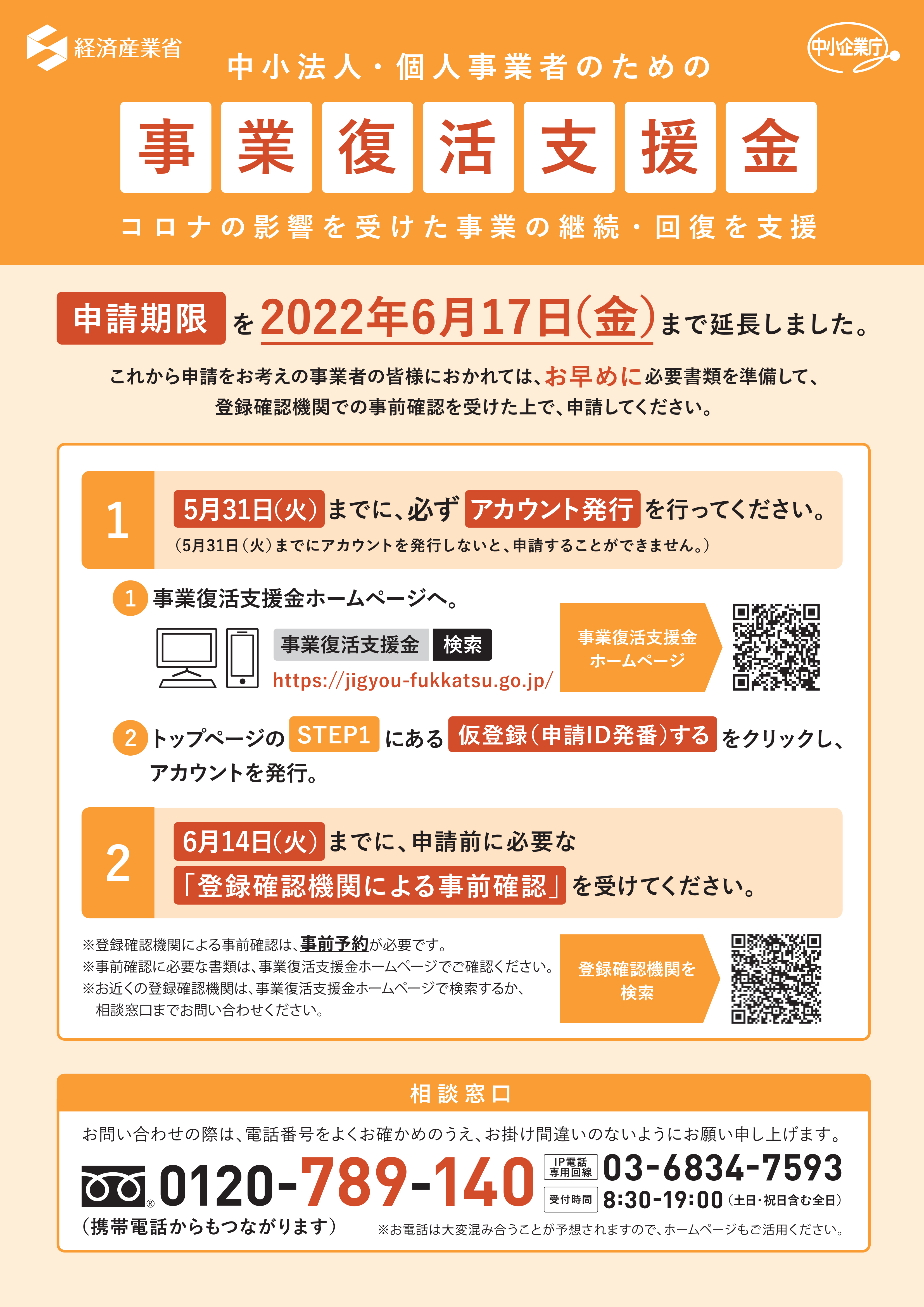 2022.05.24 ニュース 事業復活支援金の申請期限が延期になりました 新型コロナの影響を受けた事業の継続・回復を支援するための事業復活支援金の 申請期限が延長されましたのでお知らせいたします。 Social Share 前の記事 次の記事 記事一覧へ戻る